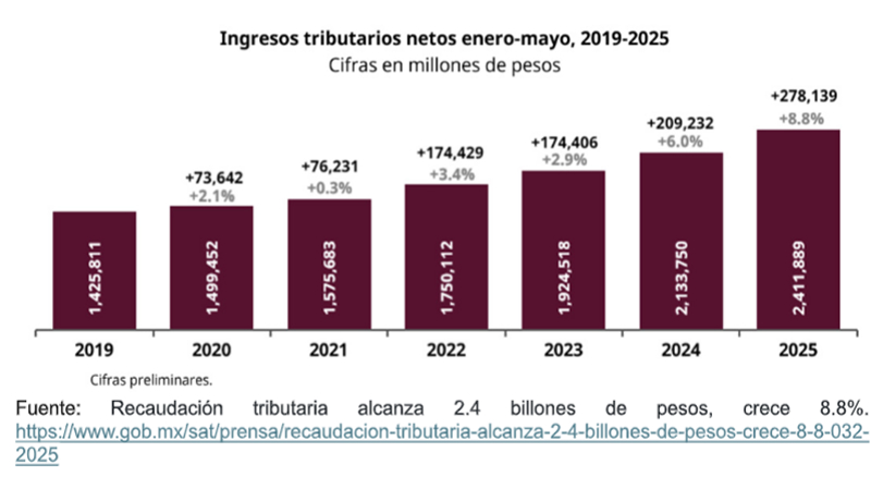 El pasado 16 de junio de 2025 el Servicio de Administración Tributaria dio a conocer un crecimiento en la recaudación para el período enero-mayo de 2025 de un 8.8% con respecto al mismo período en 2024. Lo que, como muestran los datos del mencionado organismo, lo convierten en un éxito sostenido desde 2019.